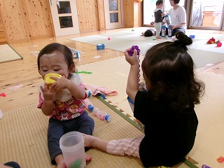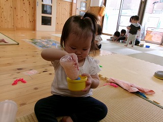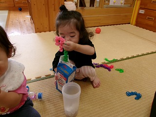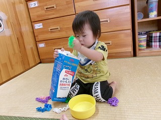 そこで、少しお母さん気分を味わえるかな?と思い牛乳パックを出してみました。初めは、潰したり覗いたりと牛乳パックを観察する姿がありましたが、段々と牛乳パックにチェーンリングを入れてみたり、そのチェーンリングをカップに牛乳を入れるように入れたりと普段お家でお母さんお父さんがしてくださっていることを真似てやってみる姿が見られました。