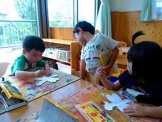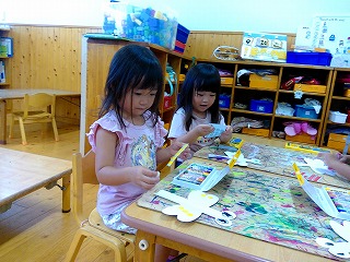 とんぼの形の画用紙に、クレヨンで好きな模様を描いたり、シールを貼ったりして飾り付けます。