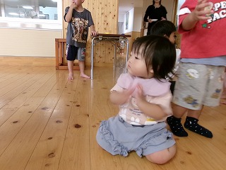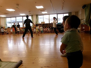 はな組の部屋ではまだ行なっていないリズムも多くあり、上手に披露してくれる大きいクラスの姿に釘付けになり見る子や拍手をし応援する子など刺激を多くもらったようです。