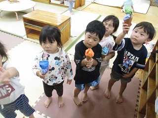 2025年10月03日 アイスクリーム🍨 2歳児 にじ 最近のお気に入りのあそびで、アイスのメニューを見ながら「どれがいい?」と選んだり、食べる真似をしたりしています。 そこで、今日はみんなでアイスを作りました♪新聞紙を丸めて色を決めて画用紙に包んでトッピングをクレヨンで描きました♪色から味を連想して「いちご」「めろん」とおいしそうなアイスが出来上がります。 一つできると「もっと作りたい!」という子が何人もいて何個も作る子もいました。 作ったアイスを持ち帰っているのでお家でも一緒に遊んでください♪ 一覧へ戻る