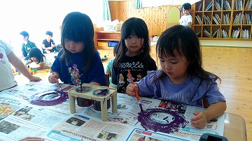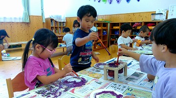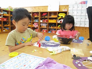 2025年10月08日 くもの巣のできあがり 3歳児 つき ハロウィンに向けてくもの巣の製作をしました。 まずは紙皿に紫色の絵の具を塗ります。「え~何になるの~これ」とこどもたちも不思議そうです。 両面塗っていくよ 紫色が何になる~? くもの巣をつくるよ 白色か黒色の毛糸をくもの巣の糸に見立てて、好きな穴に紐通しをしていきます。糸が通っていくとだんだんとくもの巣に見えてきました! 糸が通ると、くも・おばけ・飾りを貼り付けて完成です♪ お化けの顔を描いてみよう さくらグループは明日作る予定です。お楽しみに! 一覧へ戻る