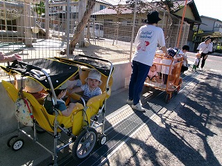 順番に手を繋いで歩きました😊中には「散歩車に乗りたい」と散歩車での景色を楽しむ子の姿も見られ、こどもたち初めての園外散歩を楽しむことができました。
