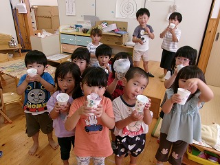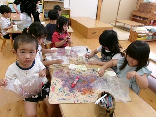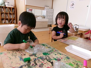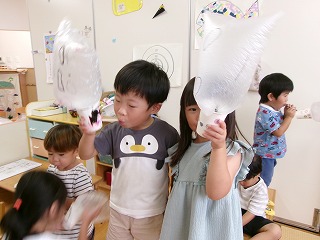 2025年10月15日 おばけだぞ~!!👻 3歳児 つき ハロウィンに向けて、おばけ風船を作りました。 紙コップに好きなシールを貼り、ビニール袋におばけの絵を描いていきます。 どんなおばけにする? これどうなるの? 保育者がストローに袋を付けて紙コップに差し込んだら完成です♪ 息を思い切りストローから吹き込んだら紙コップの中からおばけ風船がどんどんと膨らんで出てきます。 みんなで息を吹き込んだら… 膨らんだ~!! 誕生会で他のクラスに披露する予定です☆ 一覧へ戻る