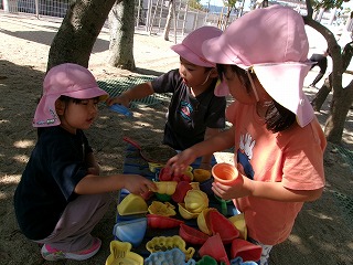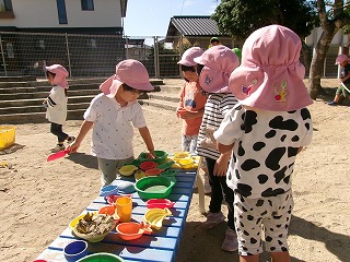 砂場では、アイスクリーム屋さんする様子も…。「いらっしゃいませ~」「何味のアイスにしますか?」「これください」「いいですよ~」と会話が広がっていました🍦