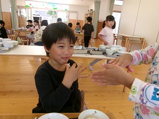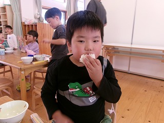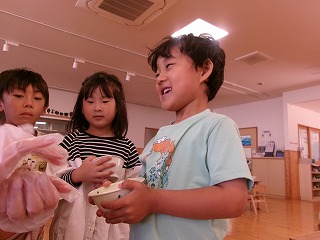 給食の白ご飯が残っていたので、そら組恒例のおにぎりタイム!