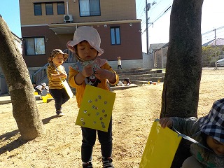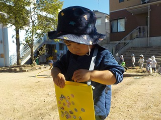 2025年11月01日 オリジナルの👜 1歳児 ゆき 散歩バックにシール貼りをして、自分だけのオリジナルのバックを作りました。 ペタペタはっていくよ~ 散歩バックを持って園庭に散策へ出かけました。 「あった!」と言いながら落ち葉を入れる姿も😊 今年はまだ葉っぱや木の実が落ちているのが少ないですが、園外にも出かけて散歩バックを活用していきたいと思います♪ 一覧へ戻る