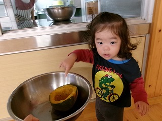 はな組で初めてのクッキングをしました。今回は、ハロウィンにちなんでかぼちゃを使って「かぼちゃのおやき」をみんなで潰したり混ぜたりしながら作りました。始めに給食室にかぼちゃを取りに行きました。事前に柔らかく蒸してもらっていたこともあり、給食室の窓を開けると甘~い、いい匂いがし思わず「うわお~」と声が出てしまうこどもがいて、いいクッキングの始まりだなと嬉しい気持ちでいっぱいな保育者でした😊