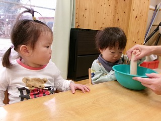 みんなが潰したかぼちゃに魔法の粉(片栗粉)を入れ、目の前で実際にホットプレートを使って焼きました。始めは音も匂いもなく興味がわかなかった子も段々においや音に気がつき見に来てました。においが強くなるにつれ自然とよだれが出ちゃう子も💕それだけ目の前で作ることの大切さを感じることができました。