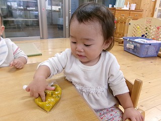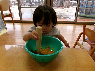保育室に帰ってからは、綿棒や袋ごしなどで思い思いにかぼちゃを潰しました。「皮が少し硬いかも⁉」という給食先生の心配もありましたが、はな組みんなで力を合わせれば問題ありません✨上手に皮も潰せました。