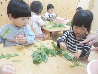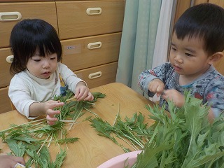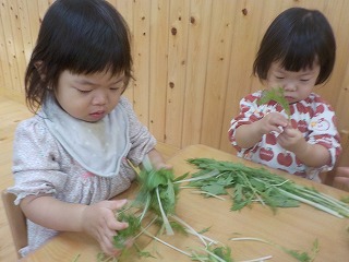 2025年11月07日 給食室のお手伝い 1歳児 ゆき 今回は水菜を小さくちぎるお手伝いをしました。 葉っぱの部分はちぎりやすかったですが、下側の白い部分は少しかたかったようで若干苦戦していたこどもたち。 それでも、「このあとの給食ででてくるよ~」と声をかけると、最後までお手伝いができました✨ またしようね♪ 一覧へ戻る
