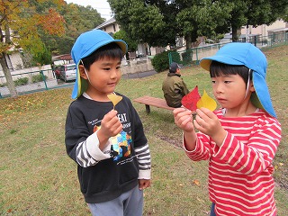 公園には、小さなどんぐりや綺麗な葉っぱがたくさん!
