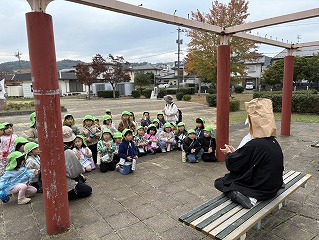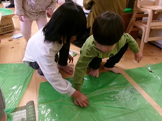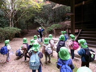 その後は千光寺で拾った落ち葉やどんぐりを使って“しっかかもっかかごっこ”のマントを作りました。