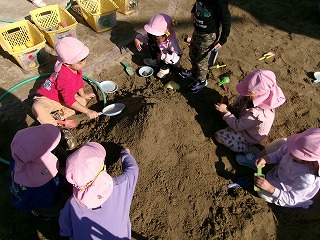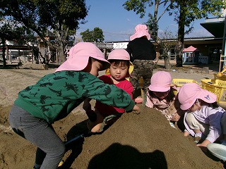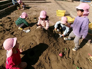 2025年11月26日 海の生き物トンネル 3歳児 つき 砂場に大きな山を作りました。 山が大きくなっていくうちにこどもたちの発想力はどんどん膨らんでいきます。 Aさん「この山で海の生き物のトンネルを作るよ」 Bさん「海の生き物が通れるくらいのトンネルを掘らなきゃ」 Aさんの声かけで、みんなが山を固めはじめ、トンネルを掘りだしました。 こどもたちの想像力は面白いなぁと感じた一場面でした。 同じイメージを持って遊べる姿を見て、こどもたちの成長を感じることができました。 一覧へ戻る