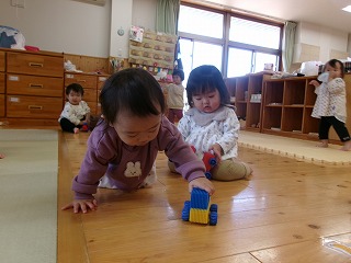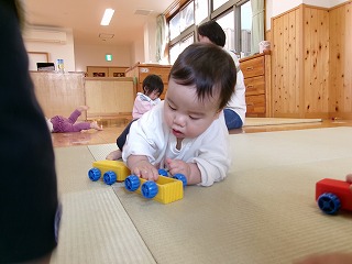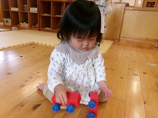 日々、ぽっとん落としやシール貼りなど指先を使ったあそびを楽しんでいるこどもたち。なんなくチェーンリングを入れたりシールを貼ったりできるようになってきたので、少し手を使って遊べる玩具を出してみました。始めは、どうやって遊ぶのか分からず「・・・」となるこどもたちでしたが、繋げてみたりチェーンリングを乗せてみたりと遊び方を知らせると遊び方が分かり、こどもたちも楽しんでいました。