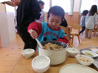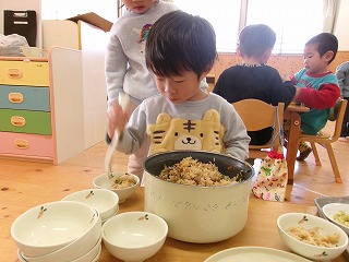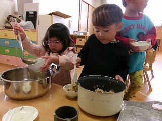 2025年12月05日 あったかご飯 3歳児 つき 寒い日が増えてきましたね。 つき組では、本格的な冬が始まるこの時期に、温かいご飯をこどもたちに提供したいという思いから、お皿に盛り付けをして提供をするのではなく、自分たちで温かい給食を盛り付けてすぐ食べるという取り組みを始めました。 今までは大人が盛り付けていましたが、こどもたちも挑戦です! こぼれてしまうこともありますが、それも経験です✨ 経験を積み重ねて、できることが増えることの達成感をこどもたちにも味わってほしいなと思います。 お家でも盛り付けをしてみてもいいですね! 一覧へ戻る