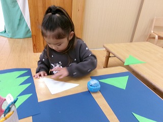 ひまわり、ちゅーりっぷグループそれぞれクリスマスツリーの製作をしました。