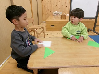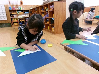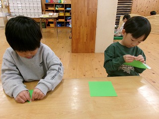ひまわりグループでは折り紙を三角に折り、それを切ってのりで貼っていきました。