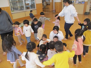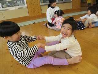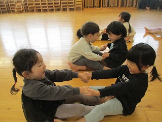 2025年12月12日 手をつないで 2歳児 にじ 『なべなべそこぬけ』のわらべうたがブームです。保育者が口ずさむとペアの友だちを見つけて楽しんでいます。なかなかうまく返らないのですが、二人ですると楽しそうです。今日はリズムあそびをしながら最後は『なべなべそぬけ』や『かごめかごめ』を楽しみました。((『なべなべそこぬけ』は保育者が一生懸命「♪か~えりましょ」を手伝っていて写真がないのです…💦)友だちと手を繋ぐと自然とみんな笑顔になるのがかわいいです❤ リズムあそび「おふね」 「ぎっちらこーぎっちらこー」 「かごめかごめ」今日は真ん中もいっぱいです(笑) 一覧へ戻る