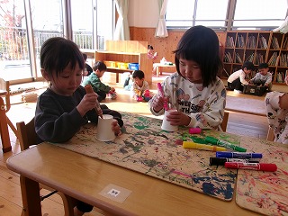 紙コップに好きな絵を描き、まつぼっくりを付けて完成。
