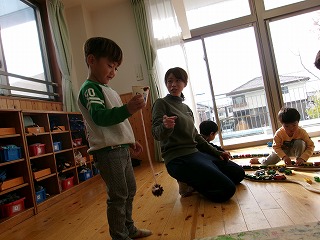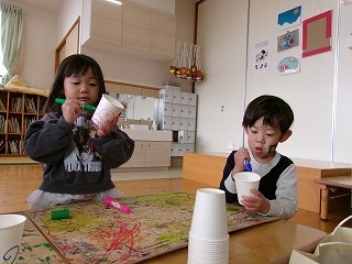 水曜日から、まつぼっくりと紙コップを使ってけん玉作りをしました。