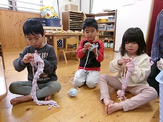 2025年12月17日 冬がきたね~ 5歳児 そら 給食を食べた後のゆっくり時間に指編みを始めてみました。 真剣な表情で毛糸を指に巻き、一つずつ編んでいます。 あったかそうなもこもこのマフラーが完成すると 嬉しそうに他のクラスの職員にみてもらい 「すごいね!」「素敵だね」と褒めてもらうと恥ずかしそうに にこにこしていました。 一覧へ戻る