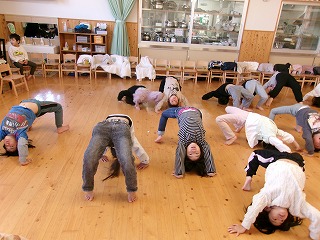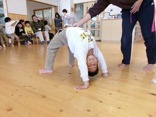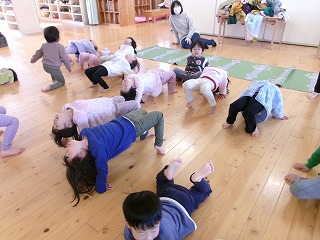 2025年12月24日 つき組だってできるもん! 3歳児 つき そら組と一緒にリズム運動をしました。 そら組がまず1番手にしますが、つき組のこどもたちはそら組のかっこいい姿をしっかり見てお手本にしようとします。 可愛かったのが、『ブリッジ』をした時のことです。 まずはそら組。 腕と足に力を入れて思い切り身体を持ち上げます。さすがそら組! 2番手のつき組のこどもたちもやってみよう!と挑戦です✨ そら組と何か違う…とてもおしい!けれど、一生懸命同じようにしようとする姿がとてもかわいかったです😊 一覧へ戻る