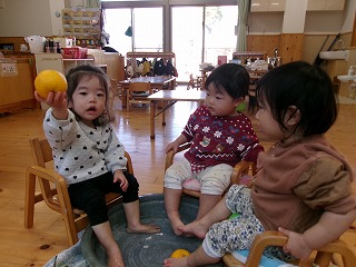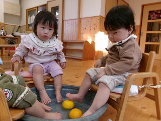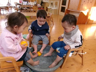 2025年12月24日 冬至🍊 0歳児 はな 22日は冬至でした。お家でもゆず湯したかな?園では、足湯でゆず湯をしました。初めはゆずそのものの匂いを嗅いでみました。 いいにおいしたかな? みかんだと思っているこどもも多く、どうにか皮を剥こうとする可愛らしい姿もあり、はな組さんらしさもありました😊 その後は、温かいお湯で足湯をしました♪ ゆず、みっけ♪ 温かくて気持ちいいね 1年の疲れが取れますように… まったり、ほっこり時間を過ごせました。後少しで今年も終わります。早いですね。残り少ないはな組生活、楽しむぞ! 一覧へ戻る