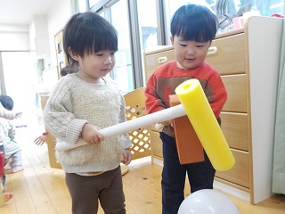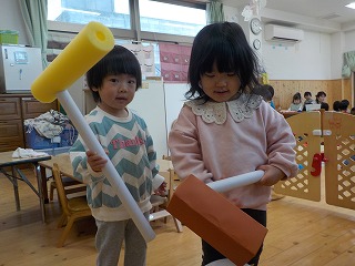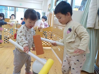 2026年01月14日 餅つきごっこ♪ 1歳児 ゆき クラスで餅つきごっこを楽しみました! もちつきの歌あそびにあわせて「ぺったんぺったん♪」と嬉しそうにつくこどもたち。以前餅つきを園庭で見たのを覚えている子もおり、「よいしょ~!」と楽しそうに杵を振りかぶっていましたよ♪ よいしょー! また餅つきごっこしようね♪ 一覧へ戻る