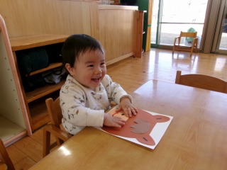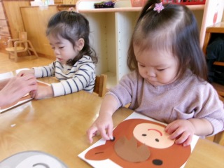 大きいクラスになれば、正しい位置にパーツを置くことができますが、はな組の子なりに一生懸命考え「ここだ!!」と言う所に嬉しそうに貼ってました😊 中には上手いこと、顔になっている子もいて「馬だ!!」と部屋で大盛り上がりました✨ ちなみに、伝統あそびにちなんだ福笑い風にしていたので、ユニークな馬ができました🐎 もう少し変身してから部屋に飾ります。お楽しみに~☆