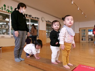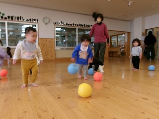 寒さが厳しい日は、身体をしっかり動かして室内でも暖かくなろう♪ということでホールに出掛け、運動あそびをしています。ホールまでの道中も「ゴーゴー」と楽しそうに出発しています。