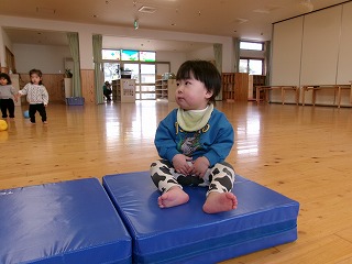 今回は低めのマットやひな壇で遊びましたが、少し高さを出したり登ったり降りたりができるあそびをしっかりしながら運動あそびを楽しみたいです。