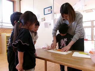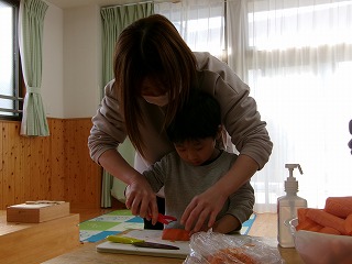 給食室のお手伝いでピーラーでにんじんの皮剥きをしました。大人の話をよく聞いて、「刃を持たないこと」「ピーラーの持ち方に気をつけること」「まな板にくっつけて剥くこと」などに気をつけながら剥き進めていました。