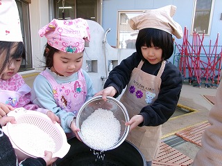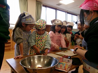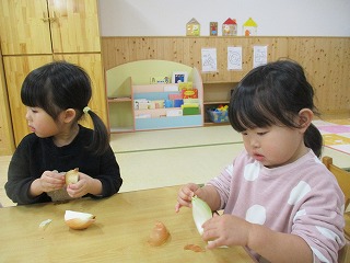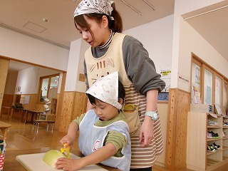そら組は『飯盒炊飯、包丁でさつまいもと玉ねぎを切る、こんにゃくをちぎる』