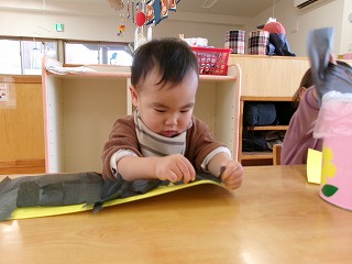 2026年01月02日 鬼のパンツはいいパンツ♪ 0歳児 はな 来月に控えた節分で使う豆入れ作りをしました👹 今回もはな組ではたくさん製作で使ってきた花紙を使い、指先で花紙を破き鬼のパンツ柄を表現しました。 今までシール貼りや顔づくりで指先は使って来ましたが、今回は「指先でつまむ」「下に引っ張る」と右と左で違う動きをしますが、上手に破くこどもたちでした😊✨ ビリビリから 破けたね♪ まだ終わっていない子も来週には行います♪節分も豆づくりも完璧なので、当日に豆入れが活躍してくれるといいなと思います。 一覧へ戻る