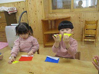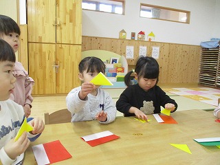 2026年01月30日 鬼だぞ! 2歳児 にじ 製作活動で折り紙で鬼を作りました。鬼が怖いという子が居ましたが怖くない鬼と分かると一緒に作ることができ、保育者と一緒に折りながらやってみました。 難しくて「どうやってするの?」と言う子が居ましたが少し折る場所を伝えると「合っとる?」と言う子が多く居ました♪ 鬼が完成すると「おにだ!」と鬼の真似をしながら歩く子がいましたよ。 自分たちで折り紙を折って作ることができて嬉しそうなこどもたちでした✨節分の日が楽しみなにじ組です✨ 一覧へ戻る