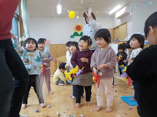 本物の鬼は怖くてなかなか豆を投げられなかったゆき組でしたが、担任が鬼役をすると、こどもたちも嬉しそうに新聞紙の豆を投げていました😊