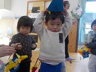 鬼の豆入れのバッグを持って、みんなで「おにはそとー!」を楽しみました♪