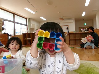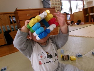 給食後のお昼寝までの好きな時間は、ここ最近ブロックであそぶ事が増えたはな組さん。最初の頃は、目新しい玩具ということもあってただ出すのが楽しかったのですが、保育者と一緒に何を作ってみたり中には長く繋げてみたりとあそび方が分かってきたようです✨そんなブロックあそびの楽しさを感じられるようになったこどもとメガネを作ってあそびました。保育者が覗きながら「お~い」とするとこどもも真似っこし「お~い」と…。保育者はしっかり穴から目が見えるようにしているのですが…穴から上手に口と鼻が出てきました♡