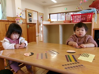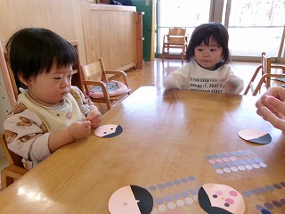 ひな人形製作第2弾『顔づくり』をしました。小さなシールに挑戦できるこどもたちは、いつもより小さなシールに挑戦✨いつものようにすんなりは貼れず…とっても苦戦しましたが、保育者に「貼って」と言わず一生懸命、右に左に持ち替え貼るこどもたちでした😊小さなシールが難しく貼れなかった子もいつもの紙素材のシールではなく、フィルム素材のシールも使ってみましたが、これまた苦戦…爪についたり貼ったはずなのになかなか顔に貼れず(フィルム素材なので粘着面が分かりづらかったようです💦)でしたが、試行錯誤しながら貼って“できた”と喜ぶこどもたちでした。