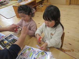 2026年02月18日 ひな人形製作 2歳児 にじ にじ組でひな人形の製作活動をしました♪ハサミで切ったり糊で貼ったり、シールを付けたりと今回はたくさんすることいっぱいでした♪ 目はどこにあるかな?口はどこかな?と聞くと自分たちの目や口を指さす子もいました。 春のころよりずっとハサミが上手く使える様になり、保育者が手を添えなくても一人で使える子も増えてきました。 ハサミの1回切りだけでなく連続切りもやってみたいな、と思っています。 一覧へ戻る
