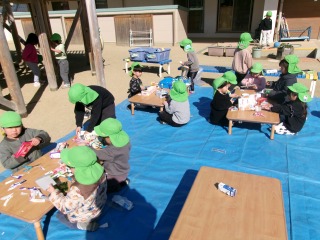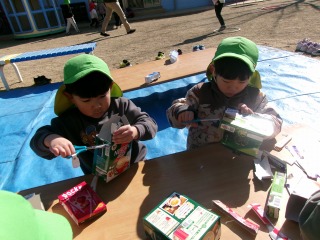 2026年02月18日 外でやってみよう♪ 4歳児 ほし 好きなあそびの中で廃材あそびを行ないました。 青空の下で作るのは気持ちがよく、手がサクサクと進んでいましたよ。 チョコを作ったり望遠鏡を作ったりと思い思いの作品が完成しました。 またお家で工夫した点など聞いてみてくださいね♪ 一覧へ戻る
