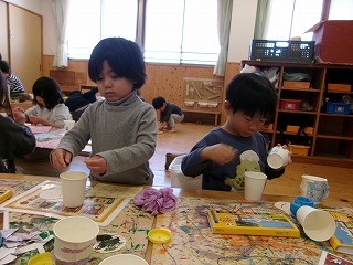 2026年02月20日 おだいりさまとおひなまさ🎎 3歳児 つき ブログ おだいりさまとおひなさまの製作をしました。 折り紙をちぎり、紙コップにのりで貼っていきます。 それぞれ2人に合った顔を描き、紙コップに貼ります。 仕上げに冠や扇子などの小物を貼ったら完成✨ 2人分を作らないといけないので、集中も2倍必要です。 「こっちをお雛様にするんだ~」とイメージを膨らませて顔を描き、満足そうなこどもたち。 ほっこりするおひなさまが完成していますので、ぜひクラスを見てくださいね♪ 一覧へ戻る