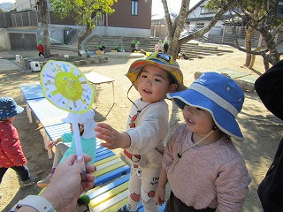 2026年02月25日 おひさまとかくれんぼ 2歳児 にじ 今にじ組では「おひさまとかくれんぼ」という絵本がブームです♪ 保育者がおひさまを園庭に隠していると、早く探しに行きたいくてうずうず・・・。 探して見つかると「あった!」と喜んで、何度か隠して遊びました♪その後はおひさまに探してもらうことにしてこども達みんなで隠れてかくれんぼをしましたよ♪ またかくれんぼをしたいと思います♪ 一覧へ戻る