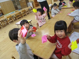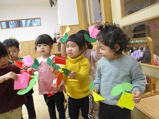 2026年02月25日 チューリップ作ったよ🌷 2歳児 にじ 折り紙でチューリップを作りましたよ♪ 半分におる、三角に折ることは分かるようになり始めてます。難しい子もいますが、保育者と一緒に折ると自分でやってみようとしていましたよ♪ 簡単な物が折れるようになってきたにじ組です✨チューリップから春が来だなぁ、と感じました。 一覧へ戻る