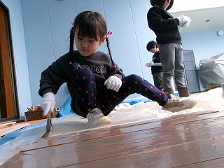 のこぎりや塗装、やすりがけなどこどもたちと一緒に進めています。
