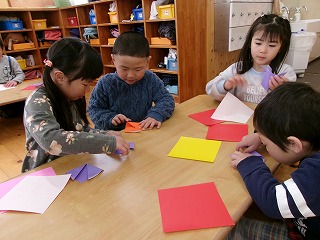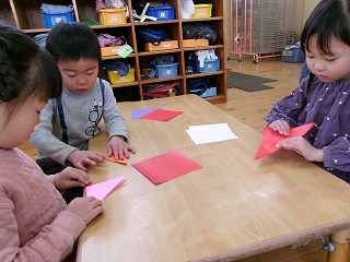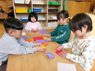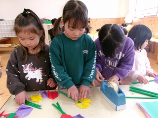 2026年03月13日 そら組へのプレゼント🌷 4歳児 ほし もうすぐ卒園のそら組さん。そんなそら組さんに折り紙でチューリップを折って花束を作りました。角を合わせることを意識して折り進めるこどもたち。折ることが難しい友だちがいたら折り方を教えてあげる姿がとても素敵です♪ 「そら組さん、喜んでくれるかな?」とそら組さんが喜ぶ姿を思い浮かべながら折っていましたよ。頑張って作った花束、そら組さん、喜んでくれるといいね☆ 一覧へ戻る